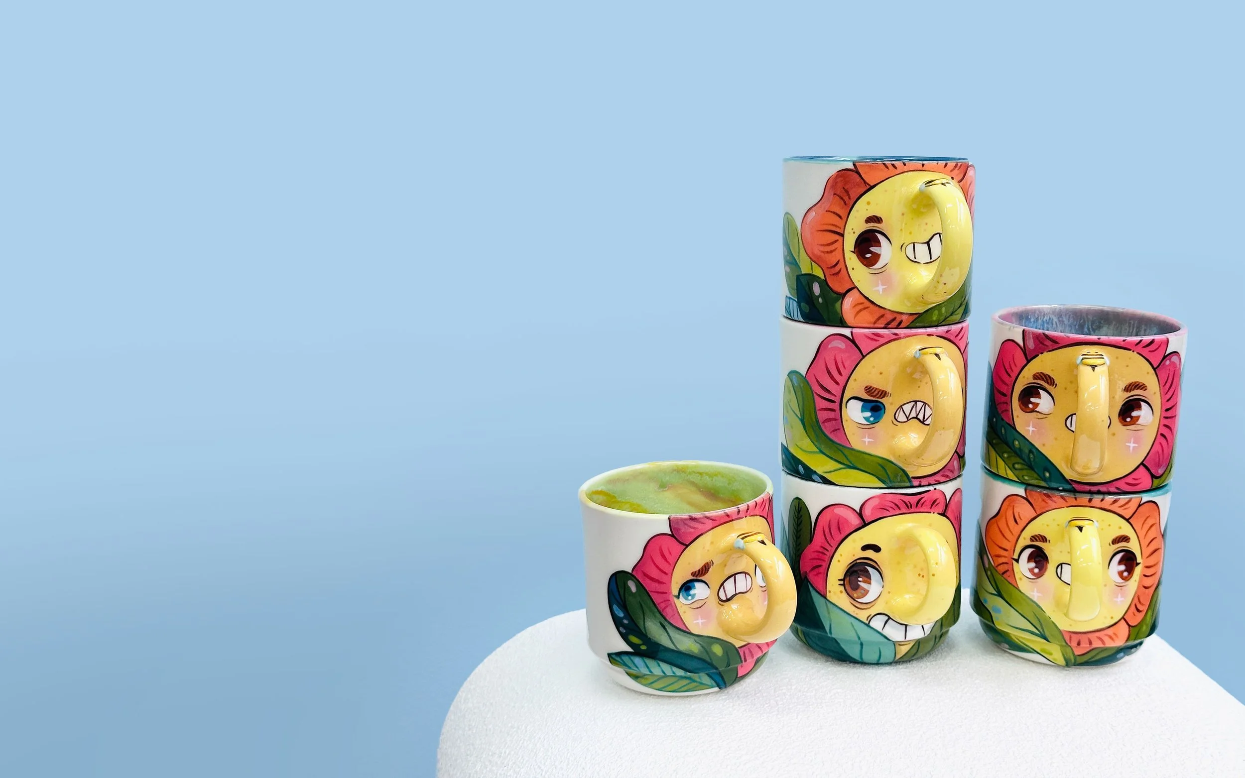 A Blind Box contains one handmade mug, randomly selected from a themed mug release. All mugs in the release share a similar form and design style, but no two are exactly the same.